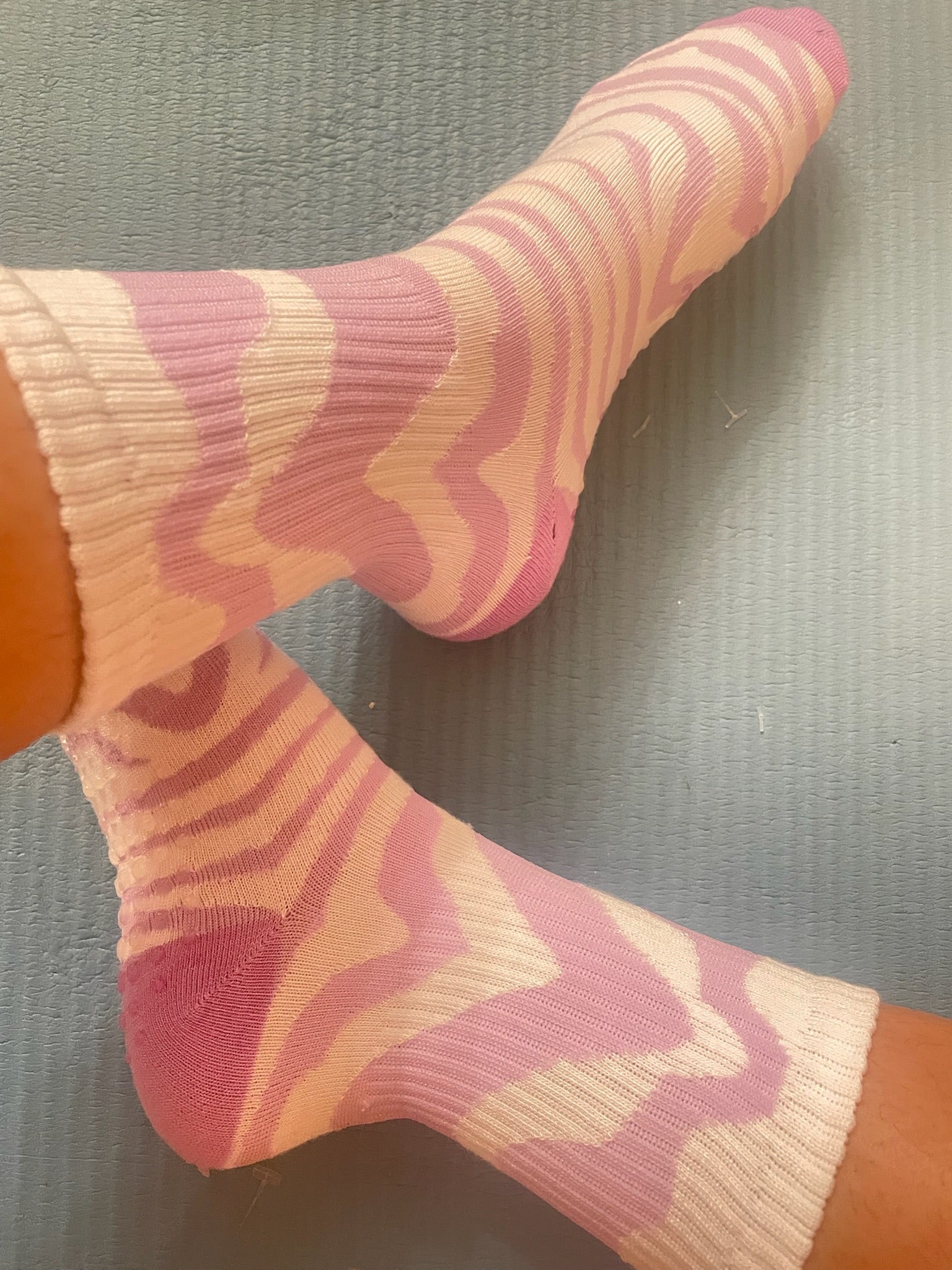 Calceta antideslizante en color blanco con animal print en morado.